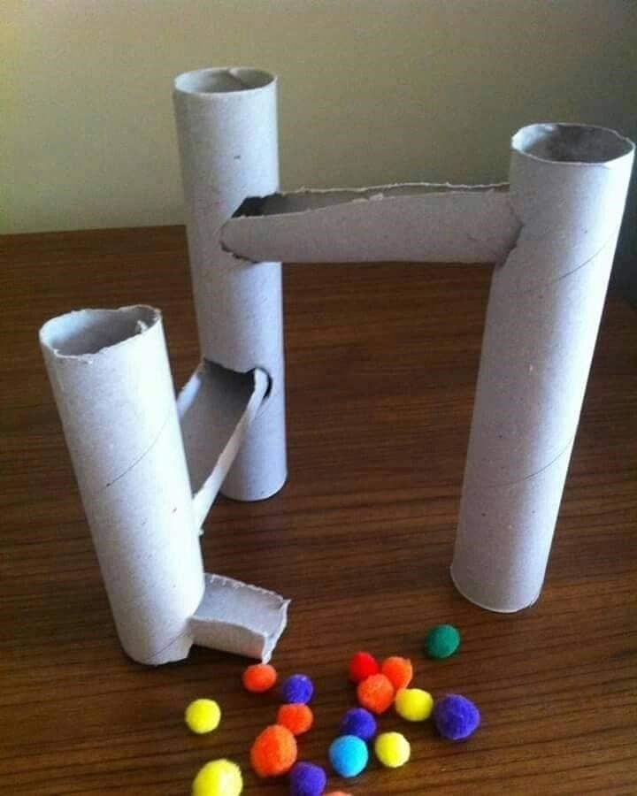 Utilize o cartão de rolos de papel de cozinha, faça pequenas aberturas e crie uma pista radical para corridas velozes com bolinhas ou pequenos carrinhos.