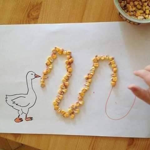 Numa folha de papel, desenhe um animal e uma linha curvilínea. Com pequenos alimentos (milho, arroz, massa, feijão, etc.), cubra a linha. Trabalhe a “pinça” dos dedos do seu bebé.