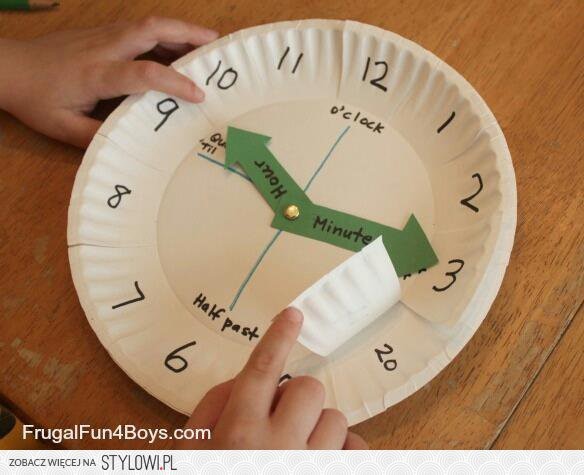 Para ensinar as horas aos mais pequenos de maneira divertida, crie um relógio usando dois pratinhos de papel (ou desenhe 2 círculos em cartão). Num dos pratos coloque as 12 horas e faça pequenos cortes ao lado de cada número. No prato de baixo, escreva os minutos.