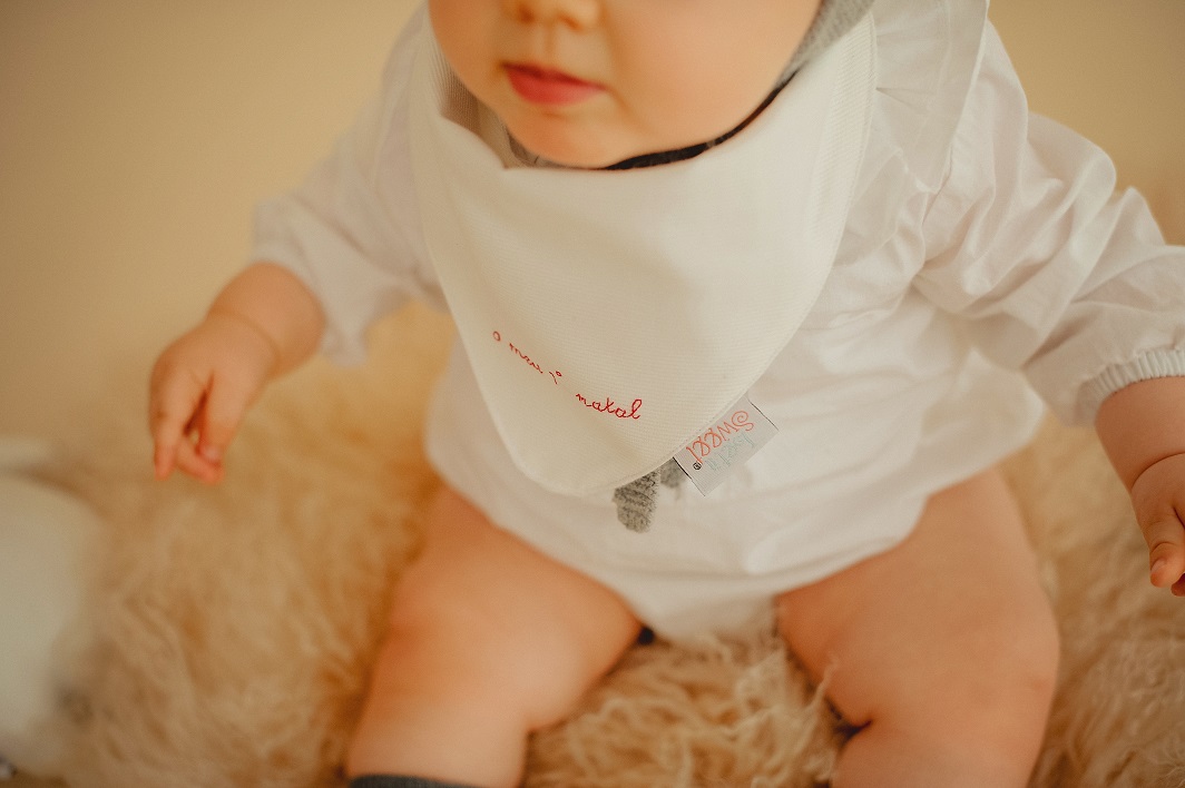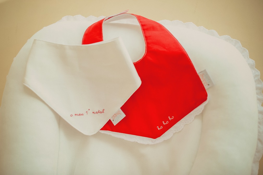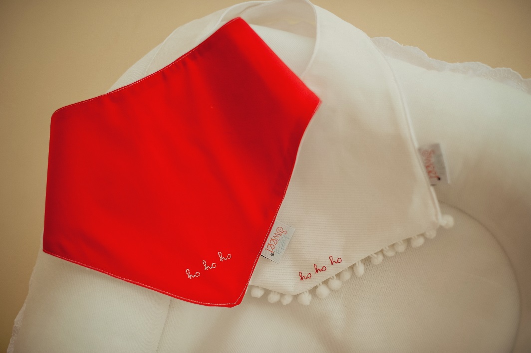Uma babete triangular feita com tecido 100% algodão e tecido impermeável.