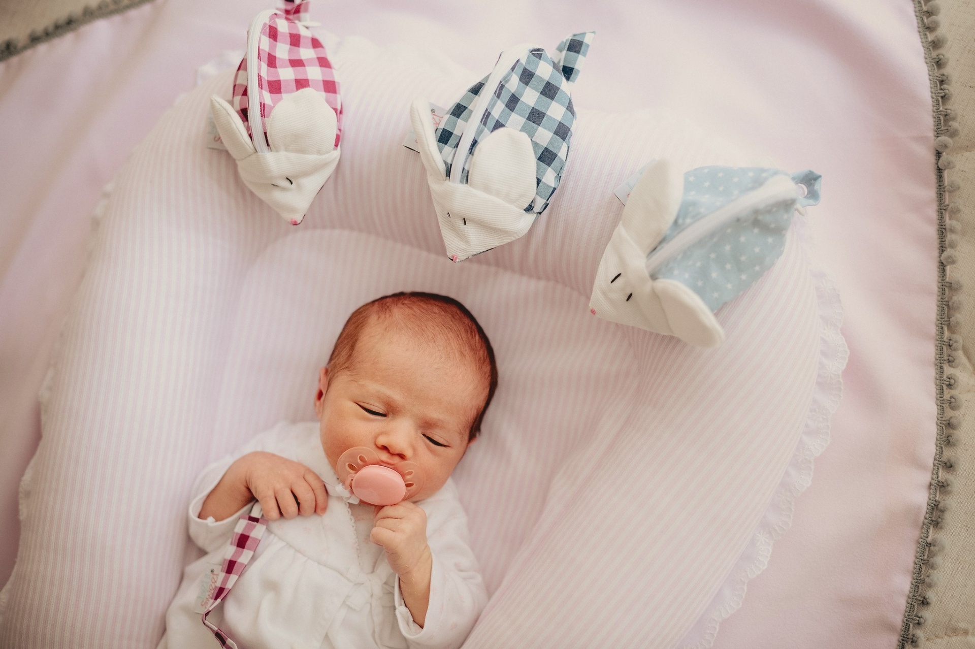Ratinho forrado, com um prático fecho e uma argola para pendurar. Fita com mola em plástico e argola para prender à chupeta.