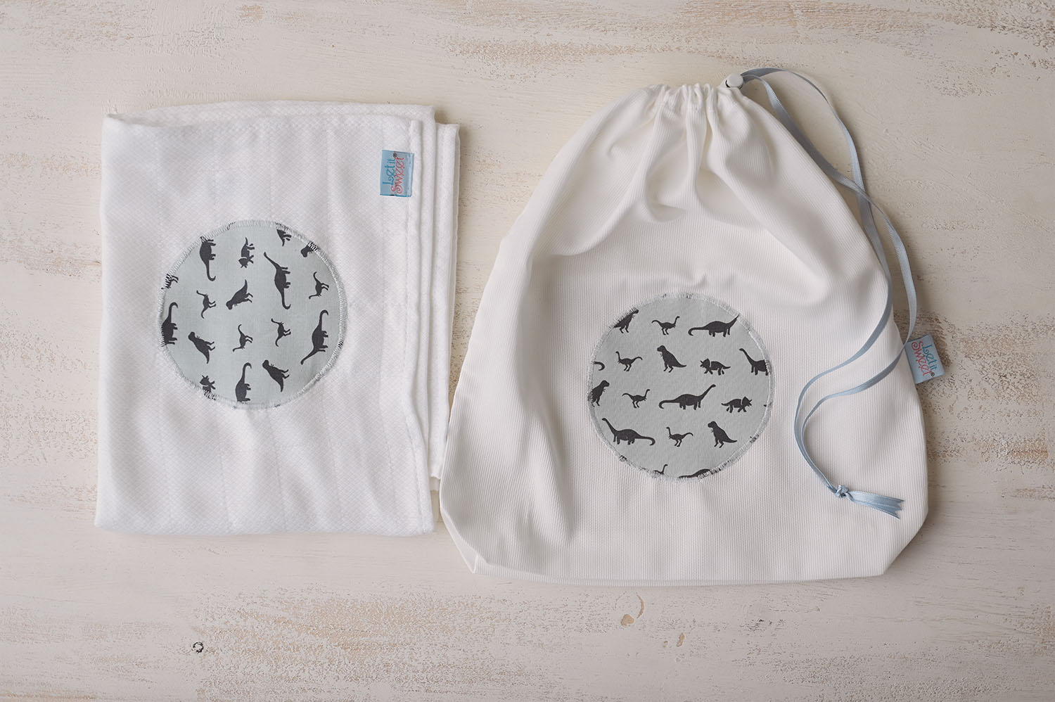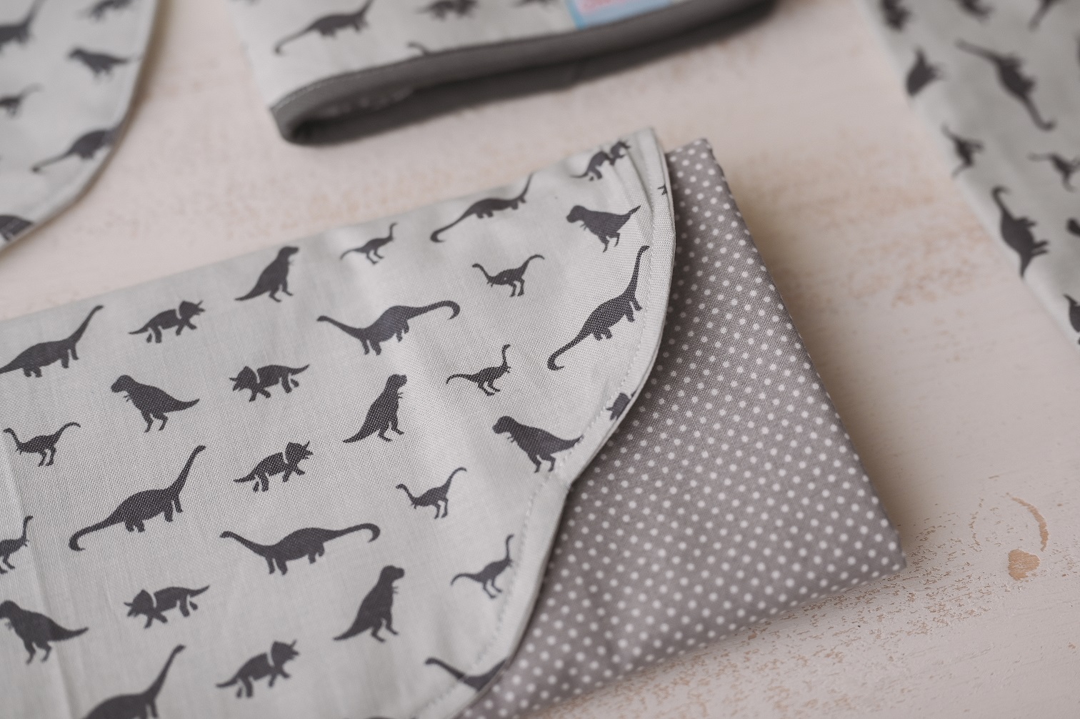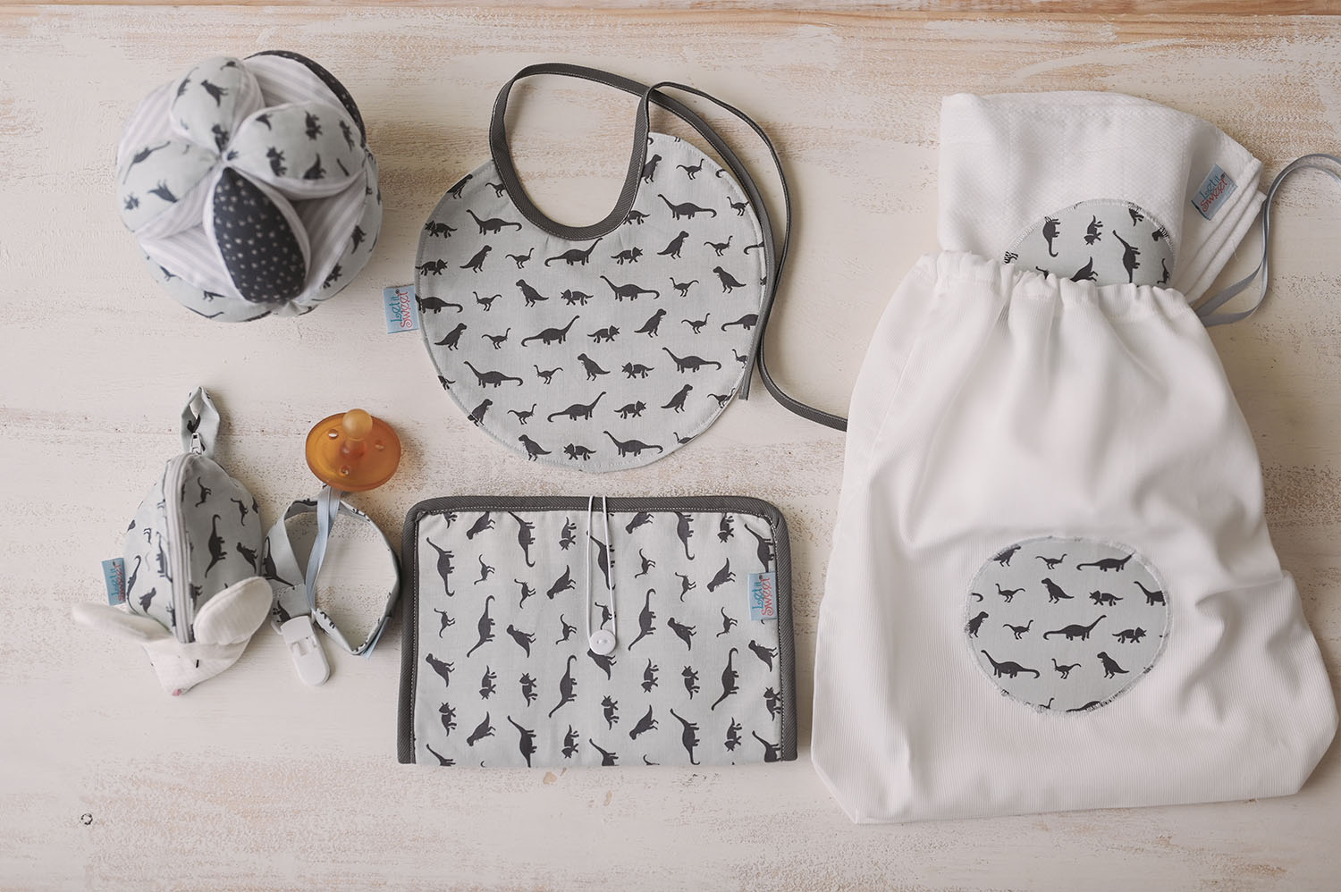 Produtos 100% algodão, muda-fraldas e babete com um lado impermeável.