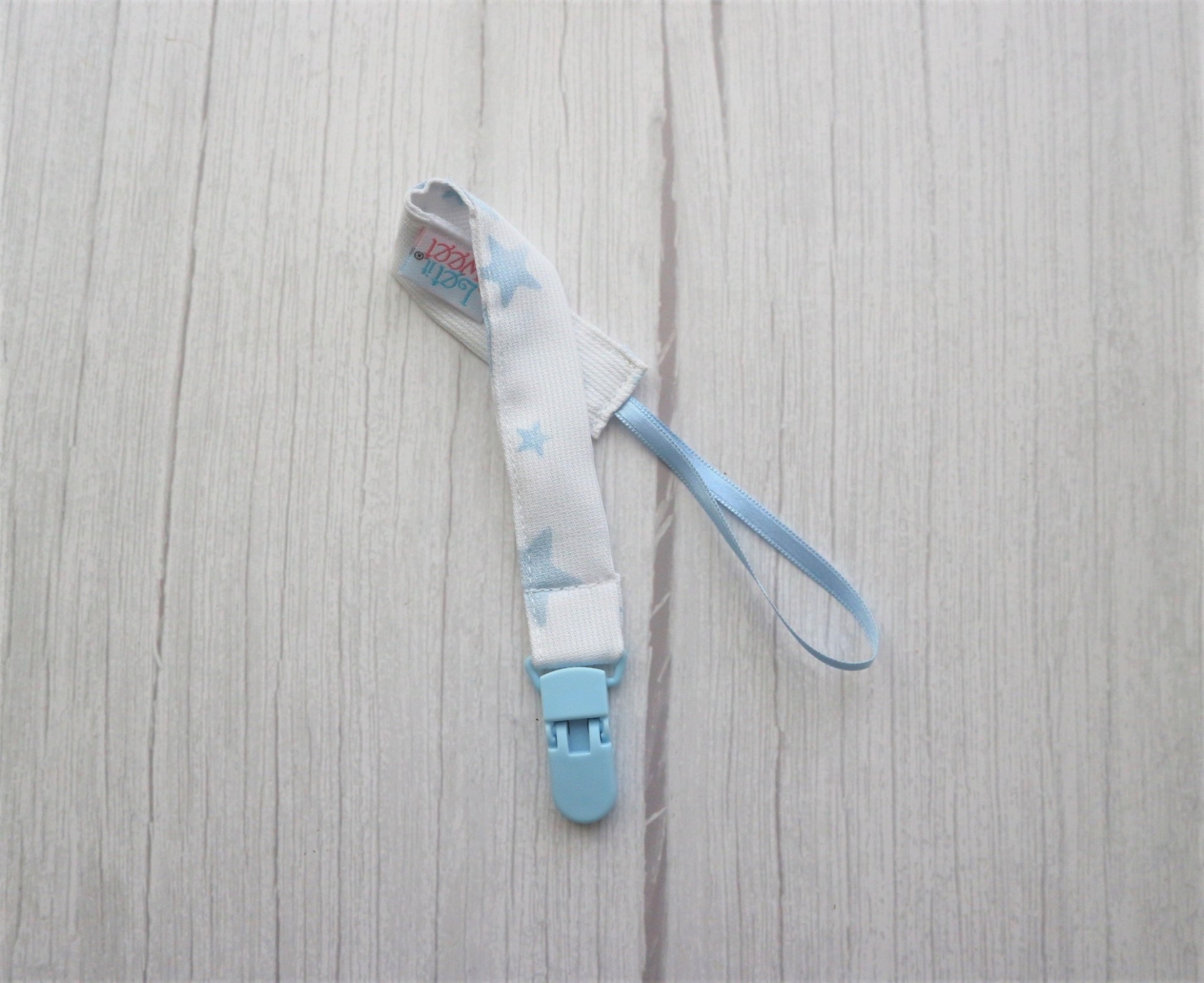 Com tecido 100% algodão, mola de plástico e uma fita que prende à chupeta.