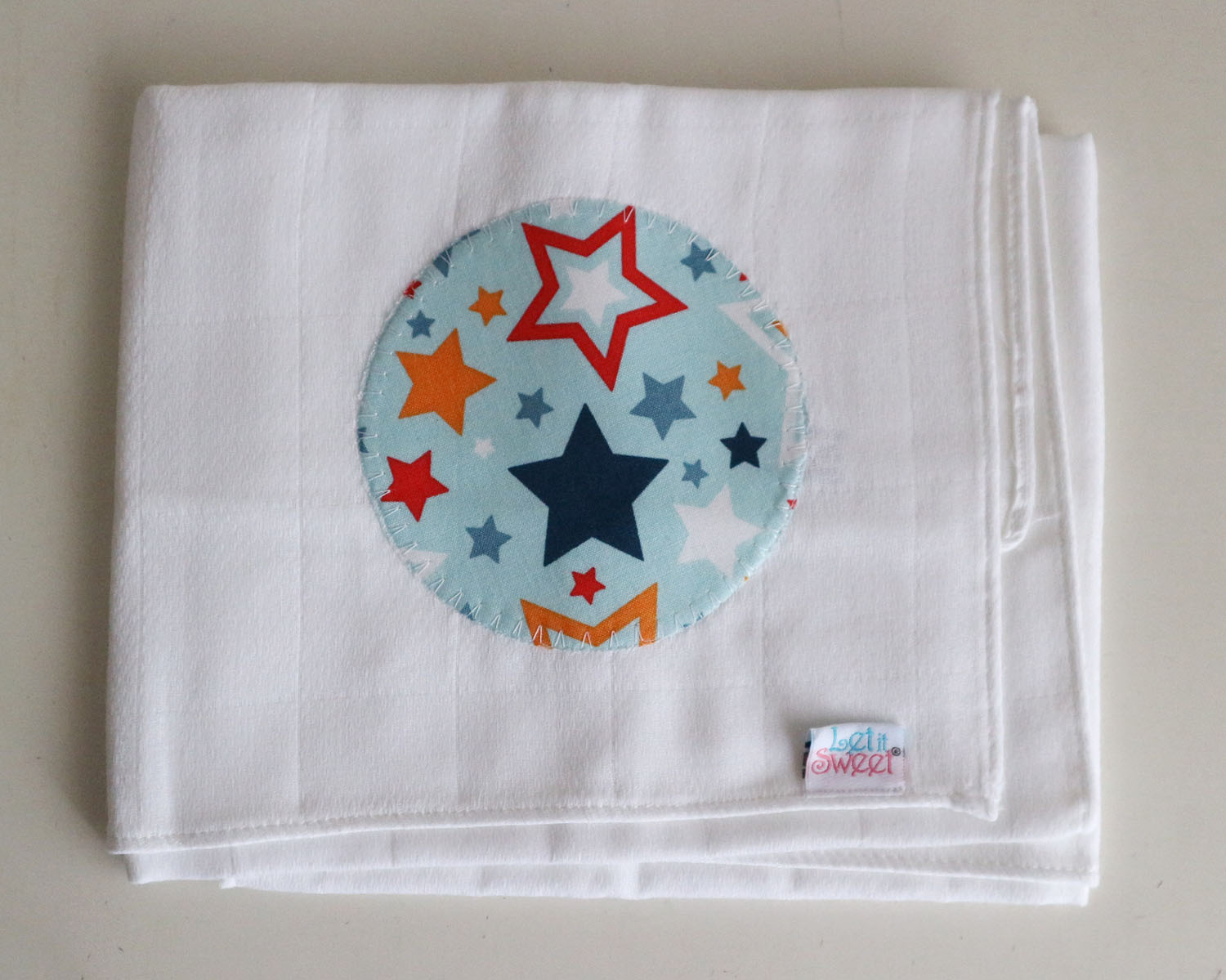 Fralda dupla de pano decorada com uma aplicação em tecido 100% algodão.