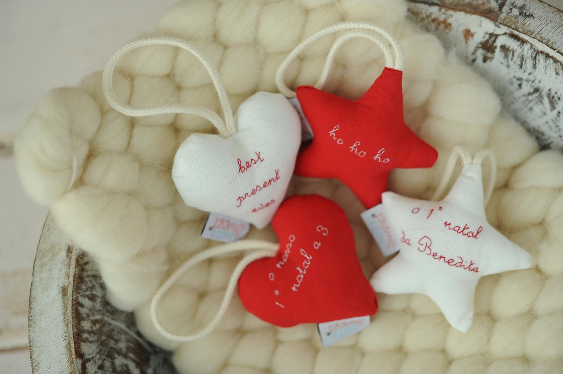 Em forma de estrela ou coração, nas cores vermelho ou branco, com a personalização que preferir. Basta indicar a frase que prefere nas opções.