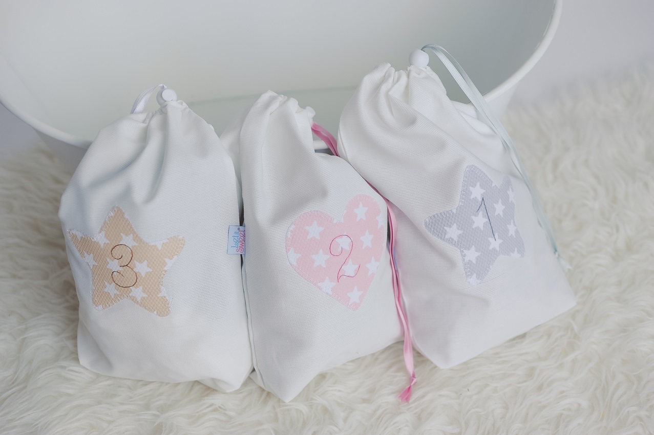 Saco de dormir branco com coração azul e nome bordado 'Jaime' e bebé vestido de branco Três sacos de tecido branco com desenhos e números